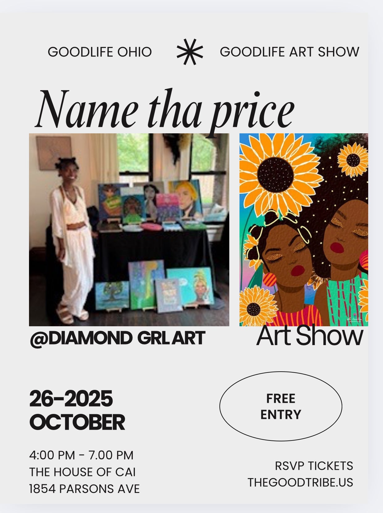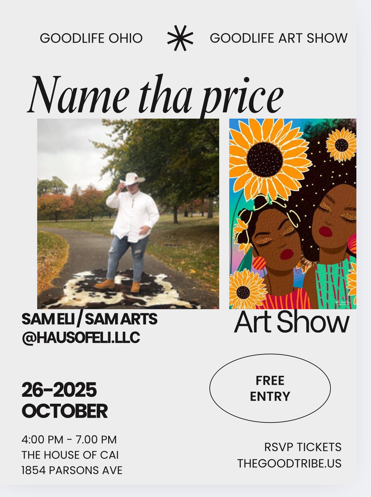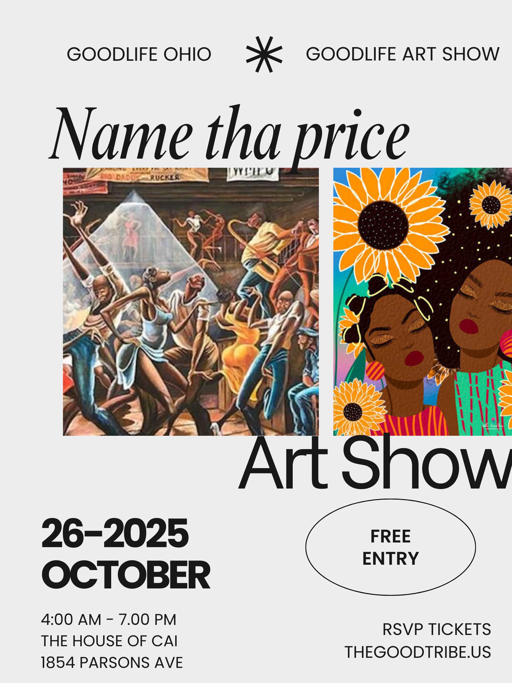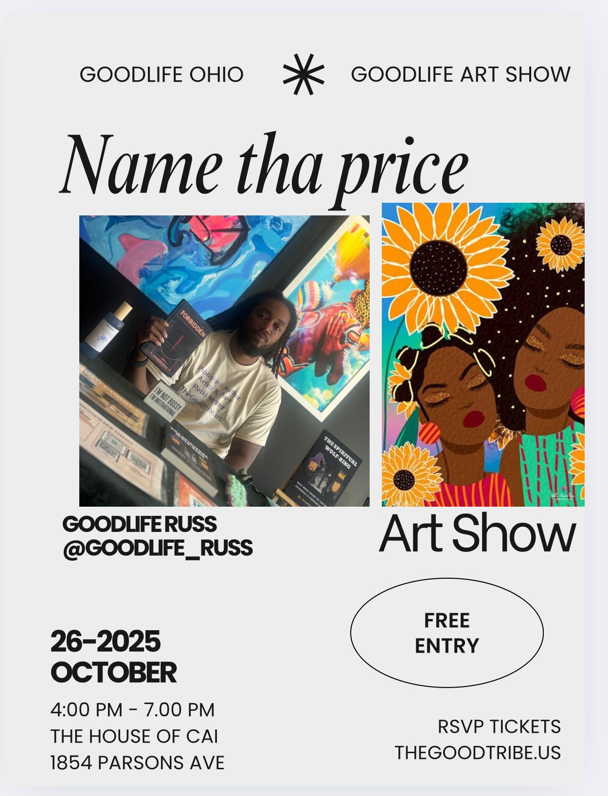 The Goodlife Art show is completely free to enter. A name your price art show featuring new and seasoned artist will hold space on October 26th 2025. Come to see community, and celebrate Scorpio season with Goodlife Russ